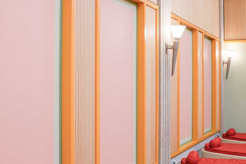 Bei der Neugestaltung des Ruheraums Silencio sollte eine ruhige und gemütliche Atmosphäre geschaffen werden. Charakteristisch für den Raum ist das Gewölbe sowie die Sichtbetonelemente, die im neuen Gestaltungskonzept bewusst erhalten und gestalterisch hervorgehoben werden.